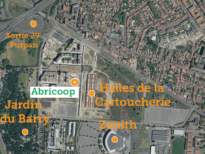 Où Première coopérative de centre-ville, Abricoop est située au Sud-Est de Toulouse, dans le quartier de la Cartoucherie, au sein de l’îlot d’habitat participatif des 4 vents. Nous sommes à quelques mètres du Jardin du Barry et de son célèbre Magnolia de plus de 200 ans et du Zénith. Tout prêt se trouvent les Halles de la Cartoucherie, Tiers lieux d’espaces éphémère en projet architectural et centre de vie du quartier. Abricoop à Toulouse Abricoop à la Cartoucherie